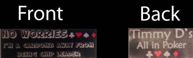 T-Shirt Order Form![]() Each time you wear this shirt to a game you will get 500 in extra chips. At Chatfield's you will get $1.00 off your first two carbombs. Price per shirt: $20.00 | |